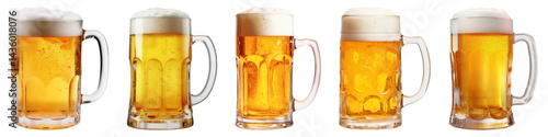 PNG Five frothy beer mugs aligned, element set on transparent background