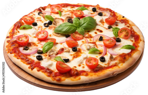 PNG Italian pizza with melted mozzarella cheese vegetable garnish tomato.