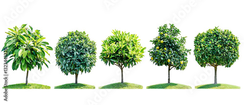 Png of Five lush green trees showcasing vibrant foliage and fruit, reflecting the beauty of nature on transparent background.