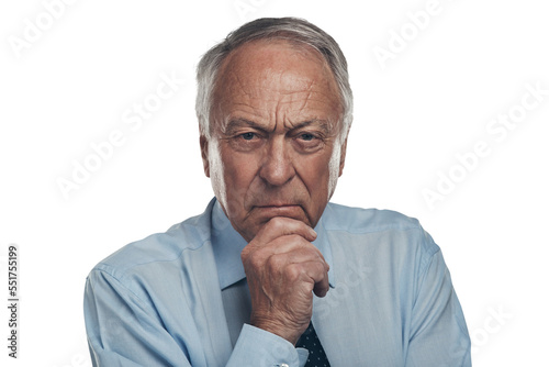 PNG shot of a senior businessman standing alone against a grey background in the studio and looking contemplative