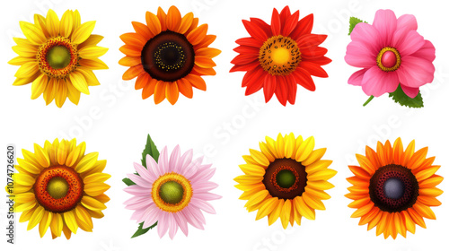 PNG Stylized spring floral vector set with bold daisies and vibrant sunflowers on a white background