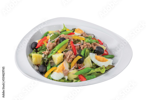 Png Tuna salad with boiled egg, tomato, lettuce, corn and red onion. Healthy and detox food concept. Ketogenic diet. Fresh vegetable salad bowl on white background. Banner