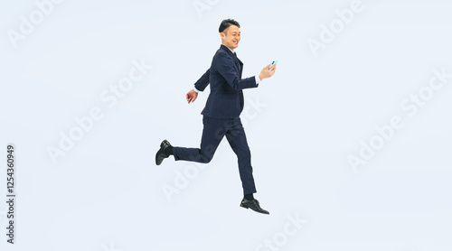 スマホを見ながらジャンプするミドル男性ビジネスパーソンの全身写真(切り抜き背景透過PNGも販売しております。作成者リンクから「PNG」で検索してください)