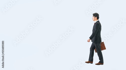横向きに歩くミドルエイジ男性ビジネスパーソンの全身写真(切り抜き背景透過PNGも販売しております。↓作成者リンクから「PNG」で検索してください)