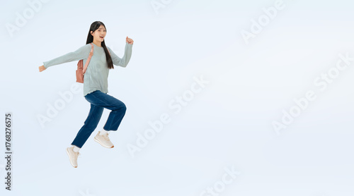 ジャンプする女子学生の全身写真(切り抜き背景透過PNGも販売しております。↓作成者リンクから「PNG」で検索してください)
