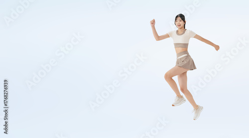 ジャンプするスポーツウェアの女性の全身写真(切り抜き背景透過PNGも販売しております。↓作成者リンクから「PNG」で検索してください)