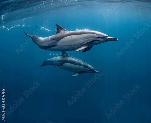 pod of common dolphins (Delphinus delphis) swimming in the Atlantic Ocean near the Western Cape coast of South Africa