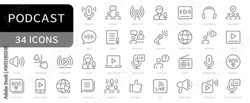 Podcast simple line icons. Broadcasting, microphone, audio, streaming editable stroke icon. vector
