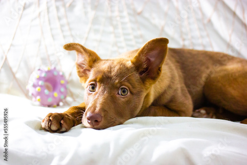 Podenco ibicenco, ibisan greyhound hunting little dog. Portrait of a funny brown puppy pup with sad eyes lying on a sofa indoors. Domestic animal with a toy. Mixed canine breed relaxing at home.