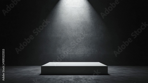 Podium and spotlighting, minimalist exhibition space. A minimalistic stage is illuminated by focused light, set against a dark background, creating a dramatic and contemplative atmosphere.