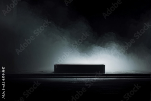 Podium black dark smoke background product platform abstract stage texture fog spotlight. Dark black floor podium dramatic empty night room table concrete wall scene place display studio smoky dust