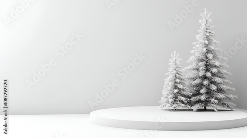 Podium in white room with Christmas tree, scene podium for presentation your product with Christmas decoration theme background , Display Podium for product and cosmetic presentation