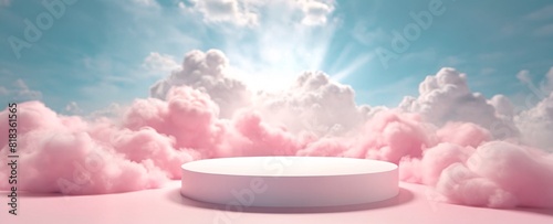 Podium pink product display on sky cloud pastel stand. Pink podium stage minimal abstract background beauty pedestal smoke showcase
