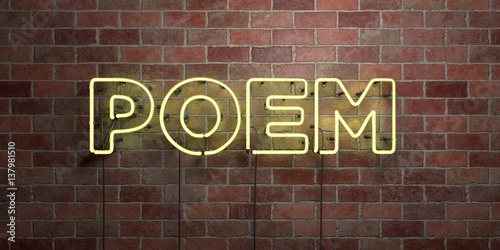 POEM - fluorescent Neon tube Sign on brickwork - Front view - 3D rendered royalty free stock picture. Can be used for online banner ads and direct mailers..