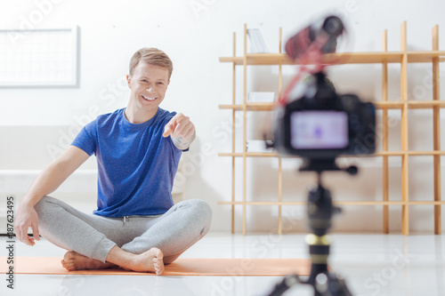Pointing. Emotional experienced video blogger sitting comfortably on his soft yoga mat and smiling while pointing to the new modern camera in front of him