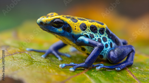 Poison Dart Frog on a tropical leaf, bright and vivid, high saturation