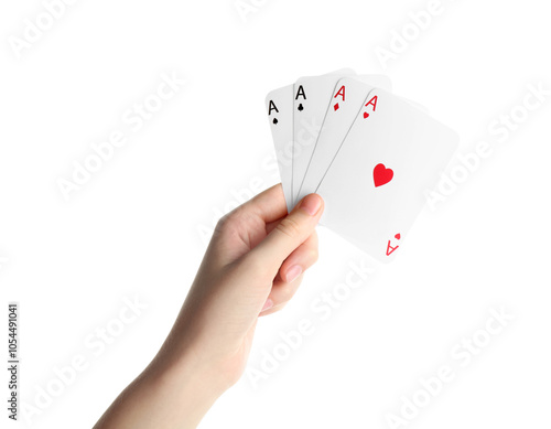 Poker game. Woman with playing cards on white background, closeup