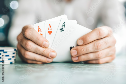Poker Player Holding Aces at Table with Casino Chips in Foreground