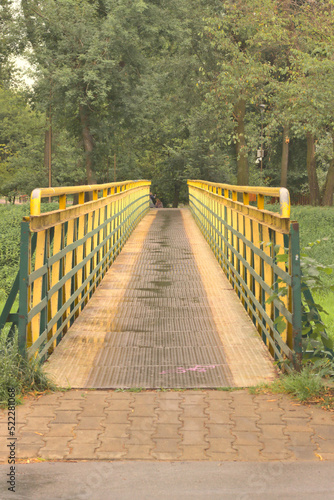Poland, Lublin, bridge over the Bystrzyca river on a rainy day.