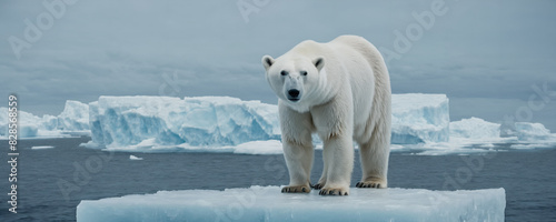 Polar bear standing on block of ice surrounded by water in the arctic sea showcasing the ice melting. Highly detailed illustration