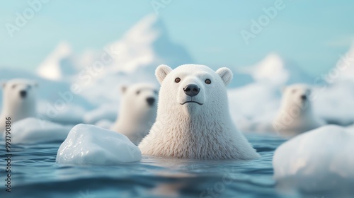Polar bear swimming in icy water, with floating icebergs.