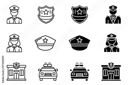Police icon set on white background. Symbol of police, lady police, police hat, police car, police, and station. Set vector line icons of police