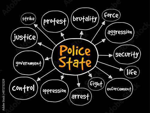 Police State describes a state whose government institutions exercise an extreme level of control over civil society and liberties, mind map text concept background