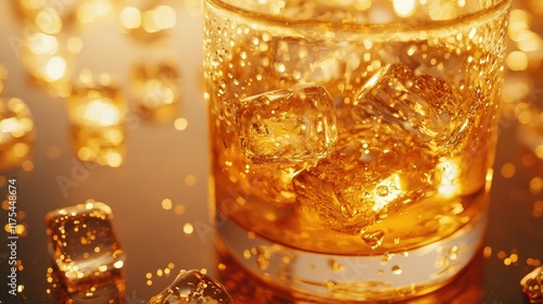 Polished bar counter set with a tumbler of golden whiskey, condensation forming on the glass, close-up of melting ice cubes.