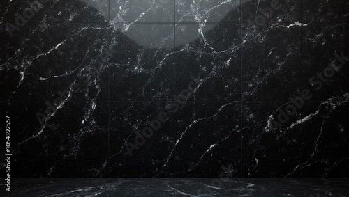 Polished black granite wall with white silver mineral flecks reflecting light elegantly