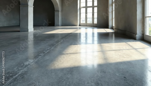 Polished concrete floor reflecting light, showcasing its smooth texture and subtle variations , bright, strong