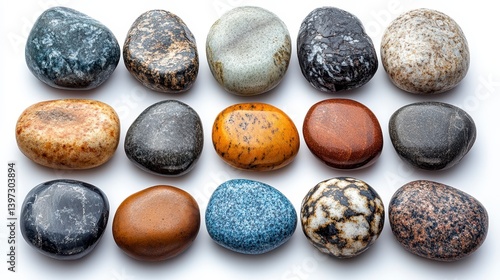 Polished pebbles! Variety of colors and textures on a white backdrop