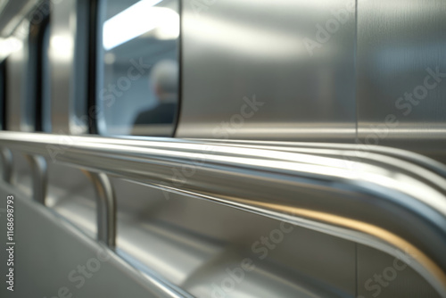 Polished stainless steel handrail and wall in a modern building, reflecting light.