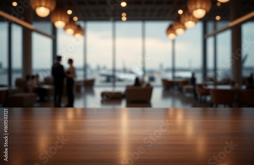 Polished walnut tabletop overlooking luxury airport lounge, aspirational interior photography for modern travel branding
