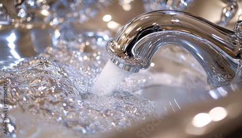 Polishing chrome fixtures at a modern kitchen sink with flowing water on a sunny afternoon