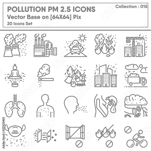 Pollution Dust PM 2.5 Icon Set, Icons Collection of Healthcare and Medical for Health Hazard Pollution Symbol. Climate Unhealthy and Sensitive for Human Breathing, Vector Illustration Concept Design.