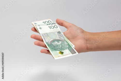 Polskie pieniądze, banknoty w kobiecych dłoniach na białym tle