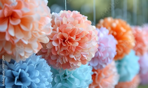 Pom poms in various colors and sizes creating a playful wedding backdrop