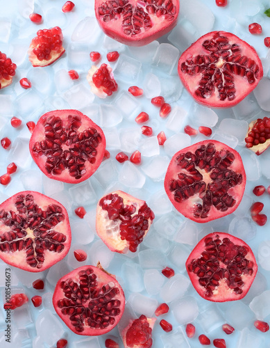 Pomegranate fruit slices on frozen surface
