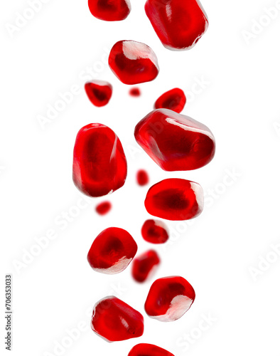 Pomegranate seeds fall in space. Surround back light. Isolated on white.