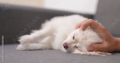 Pomeranian dog sleeping on sofa with pet owner touch on its head