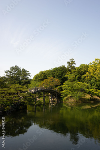 Pont japonais dans un parc asiatique, bois, forêt et arbre vert