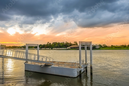 pontoon boat vintage style focus on pillar at sunset and twilight at chaopraya river, Thailand