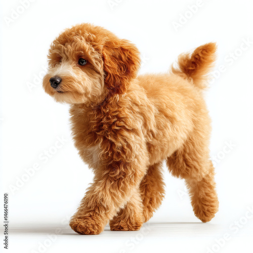 Poodle walking with wagging tail side view studio setting pet photography playful atmosphere