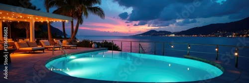 Pool area at dusk with twinkling lights and nautical elements, nighttime, nautical