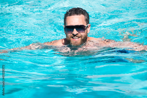 Pool resort. Handsome man at summer vacation. Man in sunglasses relaxing in swimming pool.
