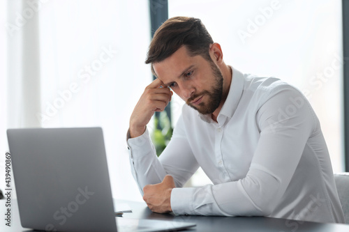 Poor financial result of the month, Frustrated businessman looking at laptop screen, analyzing bad sales month, sitting at work table in office, bankrupt