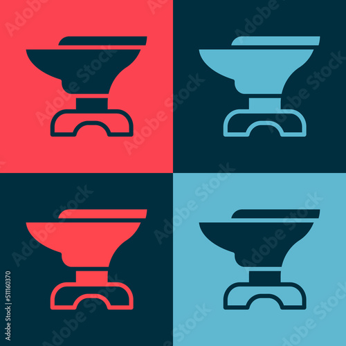 Pop art Anvil for blacksmithing and hammer icon isolated on color background. Metal forging. Forge tool. Vector