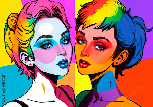 Pop art, lesbian girls loving each other. The concept of LGBT. Generative AI.