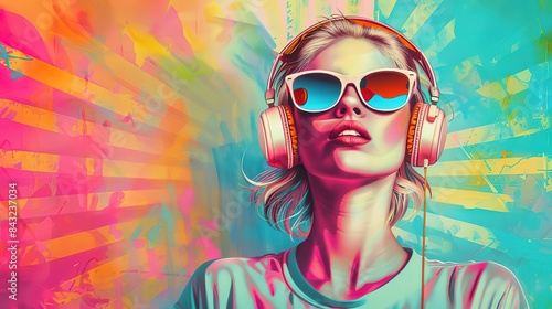 Pop art retro. A Vibrant Portrait of a Blonde Beauty in Retro Sunglasses and Headphones, Embracing the Essence of Pop Art