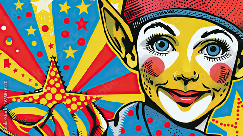 Pop-Art Christmas Elf with Wide Eyes and Cheerful Smile, Set in Bold Colors and Festive Patterns